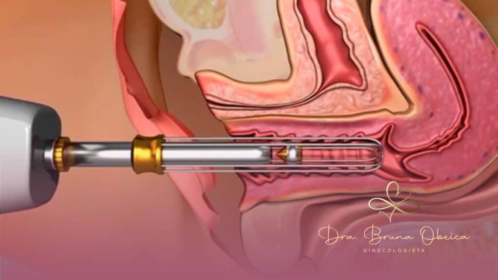 O médico insere delicadamente o aplicador de laser, de formato anatômico, e realiza a aplicação em movimentos circulares suaves pelo canal vaginal, utilizando laser de CO2 fracionado ou Erbium.